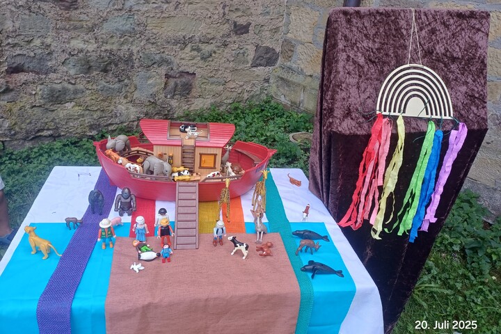 Dann sammelten die Kinder weitere Farben, jede mit eigenen Bedeutungen. Zu jeder wurde ein Juteband auf den Tisch gelegt – so entstand Stück für Stück ein farbenfroher Regenbogen. Da dämmerte es vielen: Das könnte das Zeichen sein!Um den Regenbogen besser zu verstehen, lauschten wir der biblischen Mit-Mach-Geschichte von Noah und der Arche: Gott gab Noah einen besonderen Auftrag: eine große Arche bauen und von jeder Tierart ein Paar hineinholen. Mit Begeisterung halfen die Kinder, Tiere und Figuren in Sicherheit zu bringen – gerade rechtzeitig vor dem symbolischen Regen.Dann kam die Frage auf, ob es nicht langweilig wäre, tagelang wie die Arche-Bewohner drinnen zu bleiben – und alle waren sich einig: Ja! Umso größer war die Freude, als Noah die Taube fliegen ließ und sie mit einem grünen Zweig zurückkam – einem Zeichen für neues Leben. Gemeinsam halfen die Kinder, alle Tiere und Figuren wieder aus der Arche zu befreien. Als Abschluss erfuhren alle: Gott schenkt den Menschen ein Symbol der Hoffnung und Treue: den Regenbogen.